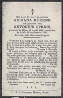 110. Antonius OPRINS. Antonius is geboren in Gilze en Rijen op 15-01-1849. om 07:00 uur ten huize wijk F nummer 99. Aangifte werd gedaan door zijn vader in tegenwoordigheid van Adriaan Raaijmakers oud 67 jaren (Wagenmaker) en van Peter Metsaars oud 24 jaren (Arbeider). De vader heeft verklaard wegens ongeleerdheid niet te kunnen schrijven of tekenen. Op 25-10-1931 overleden in Gilze en Rijen, op de leeftijd van 82 jaar. om 20:00 uur ten huize wijk D nummer 36. Aangifte werd gedaan door Franciscus Marinus van den Hout oud 52 jaren (Landbouwer) en Adrianus Cornelis van Bergen oud 43 jaren (Seinwacht Nederlandse Spoorwegen). Doodsoorzaak: Maagkanker. . Beroep: 1883 Daglooner.