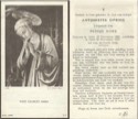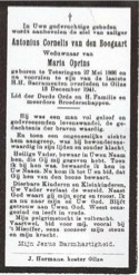 Antonia Maria OPRINS. Antonia Maria is geboren in Gilze en Rijen op 24-10-1909. om 17:00 uur ten huize wijk A nummer 75. Aangifte werd gedaan door haar vader in tegenwoordigheid van Cornelis Gerardus Everts oud 62 jaren (Schoenmaker) en Cornelis Gerardus Botermans oud 43 jaren (Kleermaker). Op 05-07-1944 overleden in Gilze en Rijen, op de leeftijd van 34 jaar. Aangifte werd gedaan door Hendrik Broeren oud 30 jaren (Opperwachtmeester) die verklaarde uit eigen wetenschap daarvan kennis te dragen.
