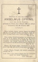 Antonius OPRINS. Antonius is geboren in Gilze en Rijen op 04-02-1899. om 22:00 uur ten huize wijk A 406. Aangifte werd gedaan door zijn vader en is geschied in tegenwoordigheid van Cornelis Gerardus Everts oud 50 jaren (Schoenmaker) en Adrianus Laurentius Botermans oud 36 jaren (Timmerman). Op 03-09-1990 overleden in Terheijden, op de leeftijd van 91 jaar.