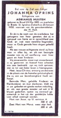 Johanna is geboren in Ginneken en Bavel op 22-04-1876. om 14:00 uur ten huize wijk B nummer 147. Aangifte werd gedaan door haar vader in tegenwoordigheid van Johannes Petrus van Wijck oud 41 jaren (Timmerman) en Lambertus de Kanter oud 30 jaren (Klerk ter Secretarie). Op 09-12-1952 overleden in Prinsenbeek, op de leeftijd van 76 jaar. om 19:00 uur. Aangifte werd gedaan door Lambertus Roovers oud 43 jaren (Lanbouwer). Beroep: 1906 Dienstbode.