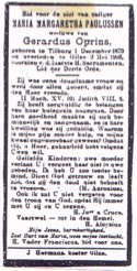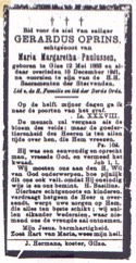 213. Gerardus OPRINS. Gerardus is geboren in Gilze en Rijen op 12-05-1883. om 07:30 uur ten huize wijk A nummer 106. Aangifte werd gedaan door zijn vader in tegenwoordigheid van Pieter Hamels oud 42 jaren (Veldwachter) en van Pieter Botermans oud 58 jaren (Timmerman). Op 10-12-1921 overleden in Gilze en Rijen, op de leeftijd van 38 jaar. om 06:00 uur ten huize wijk A nummer 104. Aangifte werd gedaan door Johannes Verhoeven oud 57 jaren (Arbeider) en Franciscus Jacobus Seegers oud 37 jaren (Arbeider). Doodsoorzaak: Pleuritis (Long en/of Borstvliesontsteking). Akte is ondertekend door Dr. Wilhelmus Robertus Petrus Hoeks. Op het doodsbriefje is de overlijdensdatum 9 december. Op Overlijdensakte 10 december. . Beroep: 1921 Leerlooiersknecht.