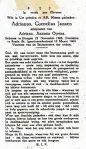 Adrianus Cornelius is geboren in Dongen op 22-11-1908. om 19:00 uur ten huize Kruidenierstraat 87. Aangifte werd gedaan door zijn vader in tegenwoordigheid van Henricus Petrus Antonius van Dortmond oud 43 jaren (Ambtenaar Secretarie) en Christiaan Kerremans oud 43 jaren (Veldwachter). Op 13-03-1963 overleden in Breda, op de leeftijd van 54 jaar. om 15:15 uur. Aangifte werd gedaan door Christiaan van Gool oud 77 jaren. Hij is begraven in Gilze. Begraafplaats Alphenseweg. Graf id-nummer: 1499338, Begraafplaatsnr.: 1966, (Plaats)aanduiding: B. 16.04. Beroep: 1936 Onderwijzer.