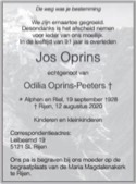 461. Adrianus Franciscus Maria OPRINS. Adrianus Franciscus Maria is geboren in Alphen en Riel op 19-09-1928. Op 12-08-2020 overleden in Rijen, op de leeftijd van 91 jaar. Roepnaam: Jos.