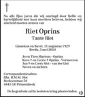 Maria Johanna Christina is geboren in Chaam op 11-08-1929. Op 03-05-2014 overleden in Breda, op de leeftijd van 84 jaar. Zij is begraven in Bavel. Begraafplaats De Lichtenberg, Deken Dr Dirckxweg 25. Graf id-nummer: 825214, Begraafplaatsnr: 410, (Plaats)aanduiding: J03-2058. Roepnaam: Riet.