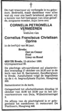 Cornelia Petronella is geboren in Princenhage op 23-01-1930. Op 13-10-1990 overleden in Breda, op de leeftijd van 60 jaar. Zij is begraven in Breda. Begraafplaats Zuylen, Haagweg 332. Graf id-nummer: 161556, Begraafplaatsnr: 314, (Plaats)aanduiding: R.IV 07-14.