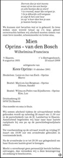 Maria Cornelia is geboren in Gilze en Rijen op 23-01-1929. Op 15-09-2008 overleden in Oosterhout, op de leeftijd van 79 jaar. Zij is begraven in Dorst. Begraafplaats St. Marcoen , Baarschotsestraat 85. Graf id-nummer: 1442594, Begraafplaatsnr: 1046, (Plaats)aanduiding: oost rij 7.09. Roepnaam: Riet.