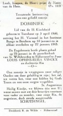 889. Dominic Maria Theresia Jacobus OPRINS. Dominic Maria Theresia Jacobus is geboren in Turnhout (Belgie) op 05-04-1960. Op 22-01-1965 overleden in Berchem (Belgie), op de leeftijd van 4 jaar. Roepnaam: Dominiek.