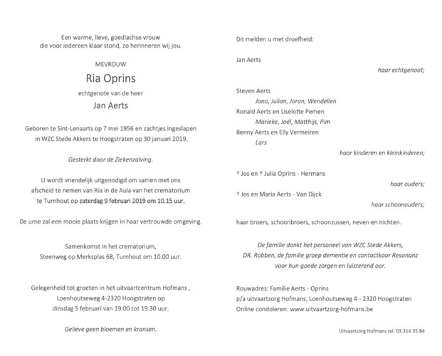 Overlijden: 30-01-2019, Hoogstraten (Belgie)