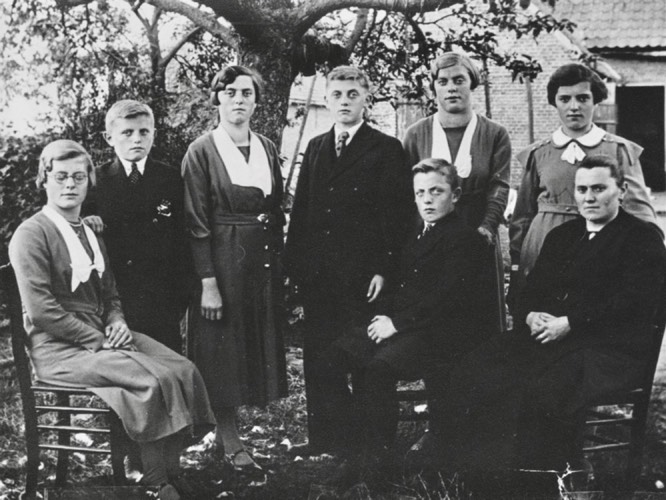 Staand vlnr: Jos, Marie, Kees, Lies, Jo,
